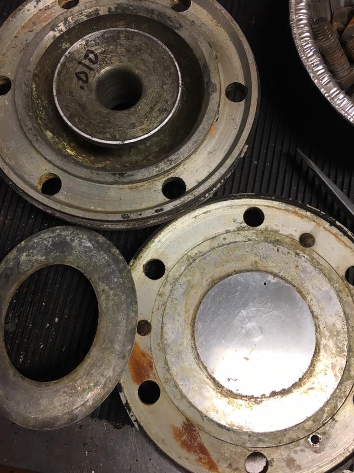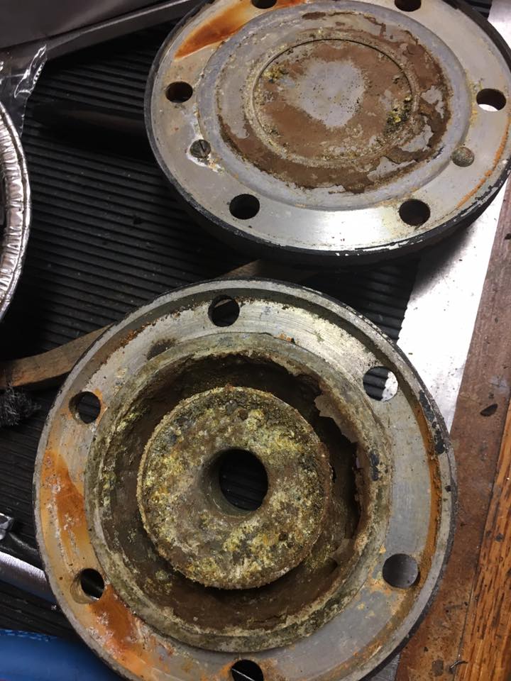 "Rebuilding some round Leslie S power chambers. As bad as these things looked, the wear on the nozzles was only moderate. That is to say nozzle protrusion ranged from .010 minimum to .012 minimum. Even with all the corrosion and fouling, light sanding of the nozzles to remove any defects, chemical cleaning of the diaphragms using Prep-n-Etch (no Scotch Brite TM was harmed in the execution of this task!) reaming out of the crud from the air passageways, light cleanup of the mounting surfaces, and careful assembly in my usual way, all the 5 power chambers work quite well without having to mess with diaphragm orientation and all the other lore and superstition regarding cleaning and assembly of non-remachined S power chambers. Sometimes you get lucky. They may not hit as "hard" as freshly machined power chambers but is an example of what you can do if you want to "preserve" the sound of a "worn-in" Leslie S horn."